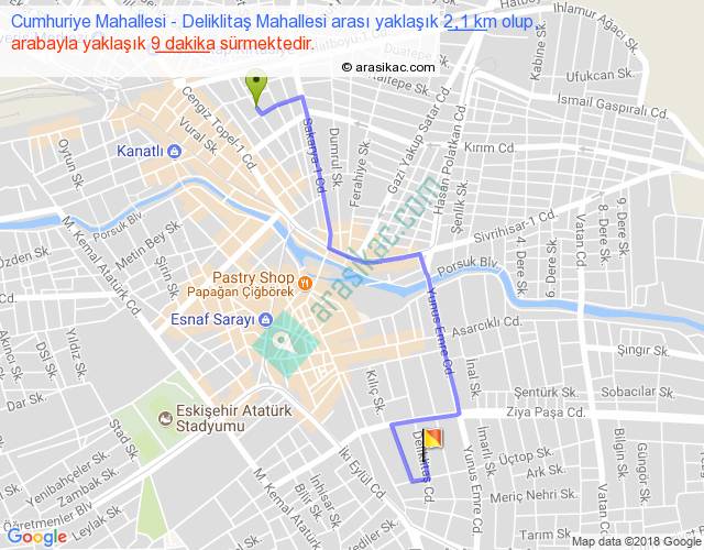 Cumhuriye Mahallesi - Deliklitaş Mahallesi arası yaklaşık olarak 90 km/h ile yukarıda belirtilen sürede olup, iki yerin kuş uçuşu uzaklığı (mesafesi) 1'dir. Yolculuk otobüsle 11 dakika sürmektedir.