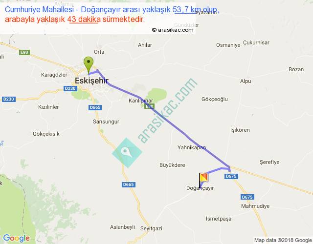 Cumhuriye Mahallesi - Doğançayır arası yaklaşık olarak 90 km/h ile yukarıda belirtilen sürede olup, iki yerin kuş uçuşu uzaklığı (mesafesi) 38'dir. Yolculuk otobüsle 55 dakika sürmektedir.
