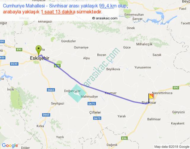 Cumhuriye Mahallesi - Sivrihisar arası yaklaşık olarak 90 km/h ile yukarıda belirtilen sürede olup, iki yerin kuş uçuşu uzaklığı (mesafesi) 94'dir. Yolculuk otobüsle 1 saat 34 dakika sürmektedir.