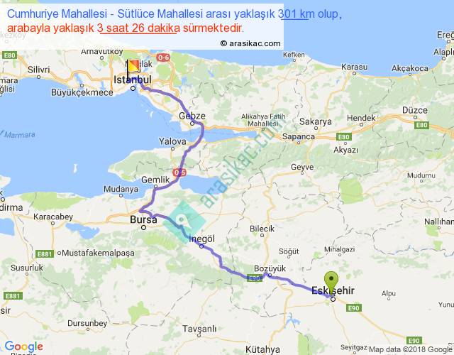 Cumhuriye Mahallesi - Sütlüce Mahallesi arası yaklaşık olarak 90 km/h ile yukarıda belirtilen sürede olup, iki yerin kuş uçuşu uzaklığı (mesafesi) 193'dir. Yolculuk otobüsle 4 saat 27 dakika sürmektedir.