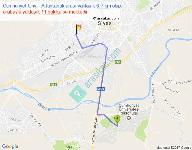 Cumhuriyet Ünv. - Altuntabak arası yaklaşık olarak 90 km/h ile yukarıda belirtilen sürede olup, iki yerin kuş uçuşu uzaklığı (mesafesi) 5'dir. Yolculuk otobüsle 14 dakika sürmektedir.