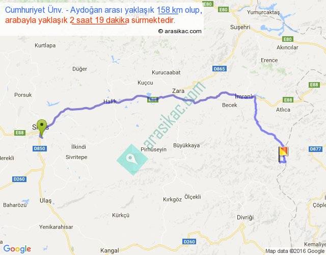 Cumhuriyet Ünv. - Aydoğan arası yaklaşık olarak 90 km/h ile yukarıda belirtilen sürede olup, iki yerin kuş uçuşu uzaklığı (mesafesi) 110'dir. Yolculuk otobüsle 3 saat 0 dakika sürmektedir.