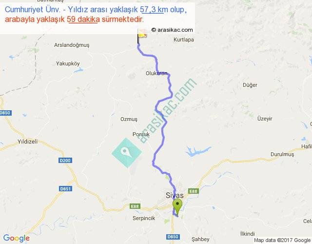 Cumhuriyet Ünv. - Yıldız arası yaklaşık olarak 90 km/h ile yukarıda belirtilen sürede olup, iki yerin kuş uçuşu uzaklığı (mesafesi) 42'dir. Yolculuk otobüsle 1 saat 16 dakika sürmektedir.