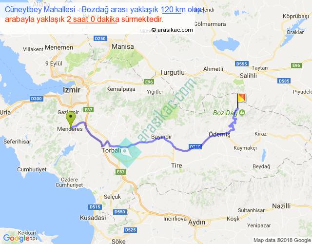 Cüneytbey Mahallesi - Bozdağ arası yaklaşık olarak 90 km/h ile yukarıda belirtilen sürede olup, iki yerin kuş uçuşu uzaklığı (mesafesi) 82'dir. Yolculuk otobüsle 2 saat 36 dakika sürmektedir.