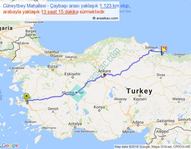 Cüneytbey Mahallesi - Çaybaşı arası yaklaşık olarak 90 km/h ile yukarıda belirtilen sürede olup, iki yerin kuş uçuşu uzaklığı (mesafesi) 901'dir. Eğer belirtilen yerler arasında uçak seferi var ise bu süre uçakla 1 saat 23 dakika'ya kadar düşebilir. Yolculuk otobüsle 17 saat 13 dakika sürmektedir.
