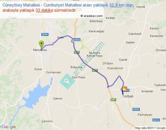 Cüneytbey Mahallesi - Cumhuriyet Mahallesi arası yaklaşık olarak 90 km/h ile yukarıda belirtilen sürede olup, iki yerin kuş uçuşu uzaklığı (mesafesi) 21'dir. Yolculuk otobüsle 42 dakika sürmektedir.