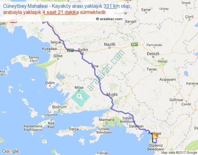 Cüneytbey Mahallesi - Kayaköy arası yaklaşık olarak 90 km/h ile yukarıda belirtilen sürede olup, iki yerin kuş uçuşu uzaklığı (mesafesi) 253'dir. Eğer belirtilen yerler arasında uçak seferi var ise bu süre uçakla 23 dakika'ya kadar düşebilir. Yolculuk otobüsle 5 saat 39 dakika sürmektedir.