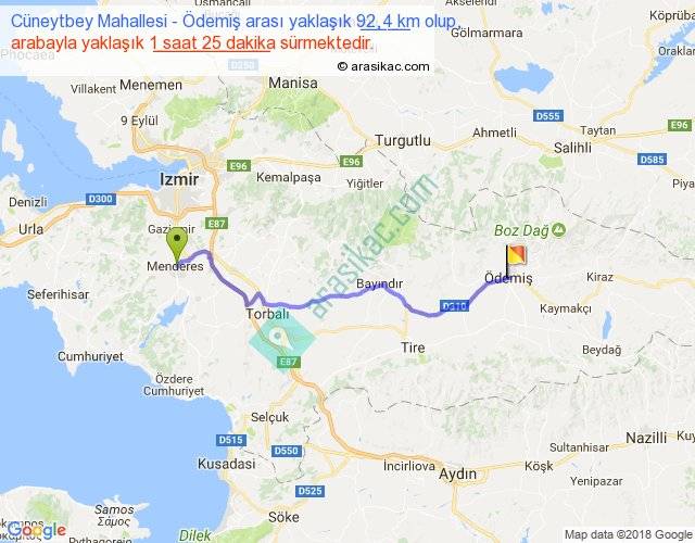 Cüneytbey Mahallesi - Ödemiş arası yaklaşık olarak 90 km/h ile yukarıda belirtilen sürede olup, iki yerin kuş uçuşu uzaklığı (mesafesi) 73'dir. Yolculuk otobüsle 1 saat 50 dakika sürmektedir.