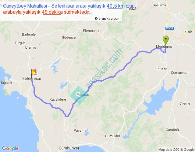 Cüneytbey Mahallesi - Seferihisar arası yaklaşık olarak 90 km/h ile yukarıda belirtilen sürede olup, iki yerin kuş uçuşu uzaklığı (mesafesi) 27'dir. Yolculuk otobüsle 1 saat 3 dakika sürmektedir.