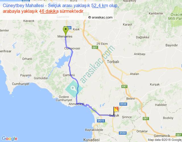 Cüneytbey Mahallesi - Selçuk arası yaklaşık olarak 90 km/h ile yukarıda belirtilen sürede olup, iki yerin kuş uçuşu uzaklığı (mesafesi) 39'dir. Yolculuk otobüsle 59 dakika sürmektedir.