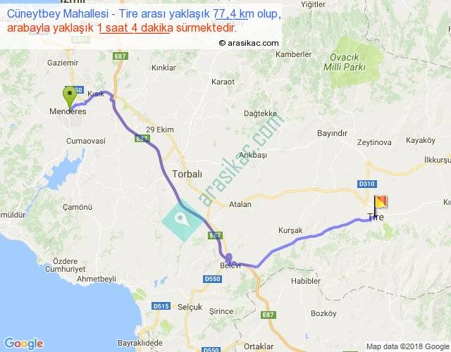Cüneytbey Mahallesi - Tire arası yaklaşık olarak 90 km/h ile yukarıda belirtilen sürede olup, iki yerin kuş uçuşu uzaklığı (mesafesi) 55'dir. Yolculuk otobüsle 1 saat 23 dakika sürmektedir.