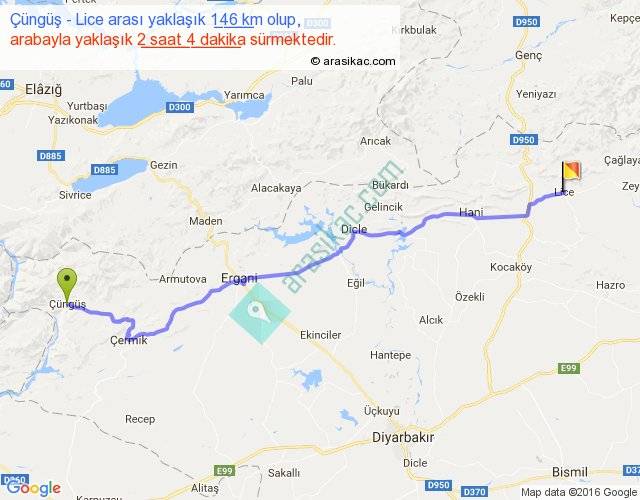 Çüngüş - Lice arası yaklaşık olarak 90 km/h ile yukarıda belirtilen sürede olup, iki yerin kuş uçuşu uzaklığı (mesafesi) 121'dir. Yolculuk otobüsle 2 saat 41 dakika sürmektedir.