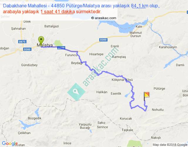 Dabakhane Mahallesi - 44850 Pütürge Malatya arası yaklaşık olarak 90 km/h ile yukarıda belirtilen sürede olup, iki yerin kuş uçuşu uzaklığı (mesafesi) 47'dir. Yolculuk otobüsle 2 saat 11 dakika sürmektedir.
