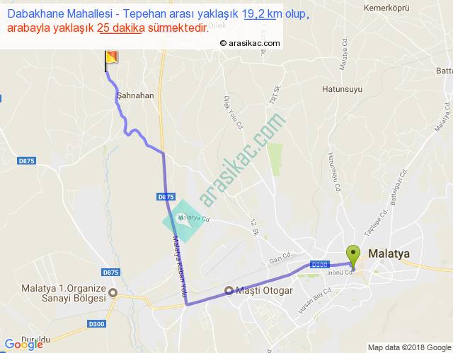 Dabakhane Mahallesi - Tepehan arası yaklaşık olarak 90 km/h ile yukarıda belirtilen sürede olup, iki yerin kuş uçuşu uzaklığı (mesafesi) 13'dir. Yolculuk otobüsle 32 dakika sürmektedir.