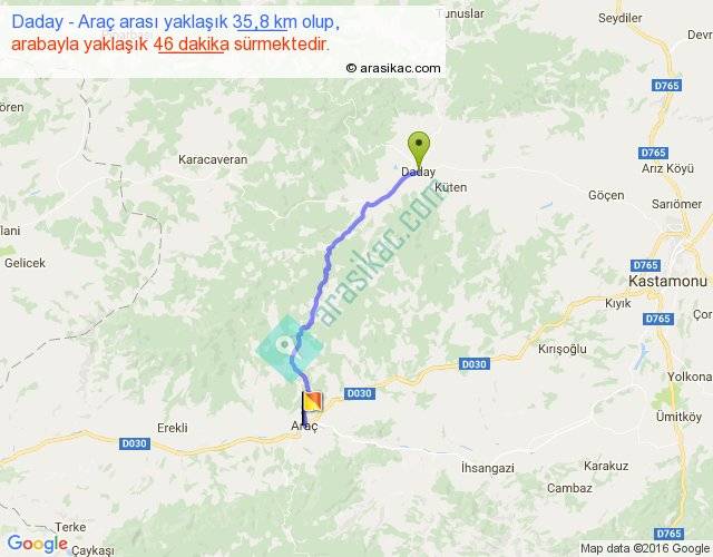 Daday - Araç arası yaklaşık olarak 90 km/h ile yukarıda belirtilen sürede olup, iki yerin kuş uçuşu uzaklığı (mesafesi) 28'dir. Yolculuk otobüsle 59 dakika sürmektedir.