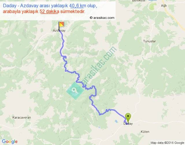 Daday - Azdavay arası yaklaşık olarak 90 km/h ile yukarıda belirtilen sürede olup, iki yerin kuş uçuşu uzaklığı (mesafesi) 23'dir. Yolculuk otobüsle 1 saat 7 dakika sürmektedir.