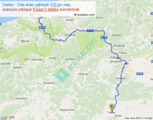 Daday - Cide arası yaklaşık olarak 90 km/h ile yukarıda belirtilen sürede olup, iki yerin kuş uçuşu uzaklığı (mesafesi) 60'dir. Yolculuk otobüsle 2 saat 36 dakika sürmektedir.