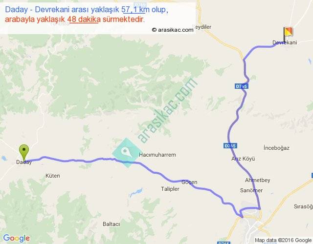Daday - Devrekani arası yaklaşık olarak 90 km/h ile yukarıda belirtilen sürede olup, iki yerin kuş uçuşu uzaklığı (mesafesi) 33'dir. Yolculuk otobüsle 1 saat 2 dakika sürmektedir.