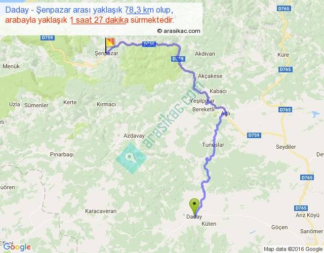 Daday - Şenpazar arası yaklaşık olarak 90 km/h ile yukarıda belirtilen sürede olup, iki yerin kuş uçuşu uzaklığı (mesafesi) 42'dir. Yolculuk otobüsle 1 saat 53 dakika sürmektedir.