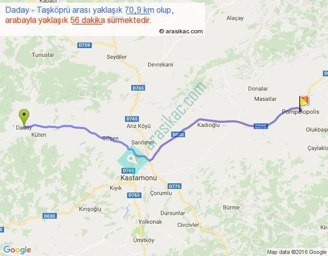Daday - Taşköprü arası yaklaşık olarak 90 km/h ile yukarıda belirtilen sürede olup, iki yerin kuş uçuşu uzaklığı (mesafesi) 61'dir. Yolculuk otobüsle 1 saat 12 dakika sürmektedir.