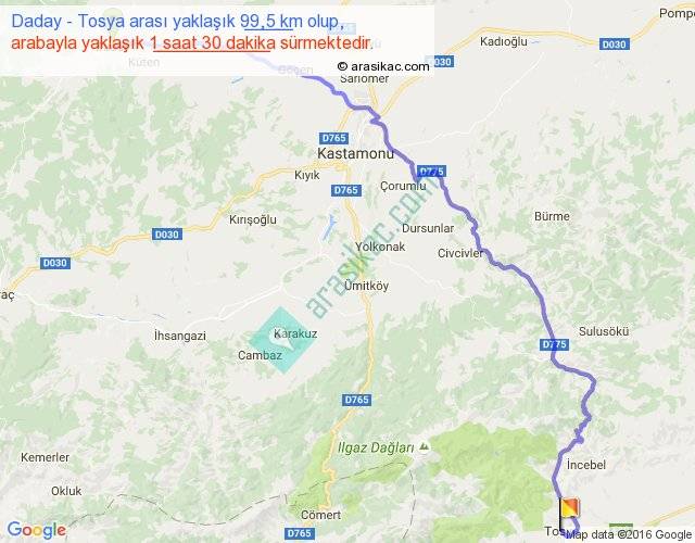 Daday - Tosya arası yaklaşık olarak 90 km/h ile yukarıda belirtilen sürede olup, iki yerin kuş uçuşu uzaklığı (mesafesi) 69'dir. Yolculuk otobüsle 1 saat 57 dakika sürmektedir.
