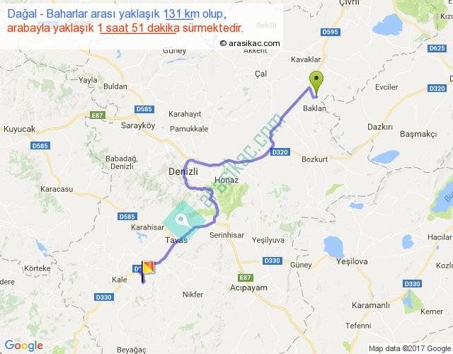 Dağal - Baharlar arası yaklaşık olarak 90 km/h ile yukarıda belirtilen sürede olup, iki yerin kuş uçuşu uzaklığı (mesafesi) 86'dir. Yolculuk otobüsle 2 saat 24 dakika sürmektedir.