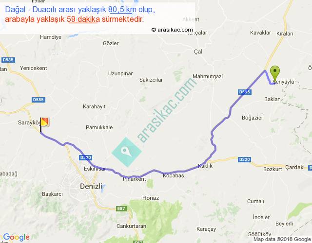 Dağal - Duacılı arası yaklaşık olarak 90 km/h ile yukarıda belirtilen sürede olup, iki yerin kuş uçuşu uzaklığı (mesafesi) 59'dir. Yolculuk otobüsle 1 saat 16 dakika sürmektedir.