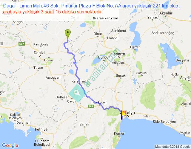 Dağal - Liman Mah.46 Sok. Pınarlar Plaza F Blok No:7 A arası yaklaşık olarak 90 km/h ile yukarıda belirtilen sürede olup, iki yerin kuş uçuşu uzaklığı (mesafesi) 156'dir. Yolculuk otobüsle 4 saat 13 dakika sürmektedir.