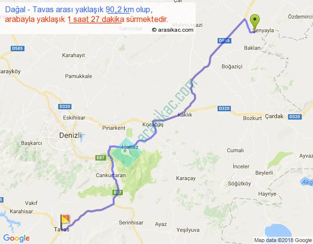 Dağal - Tavas arası yaklaşık olarak 90 km/h ile yukarıda belirtilen sürede olup, iki yerin kuş uçuşu uzaklığı (mesafesi) 68'dir. Yolculuk otobüsle 1 saat 53 dakika sürmektedir.