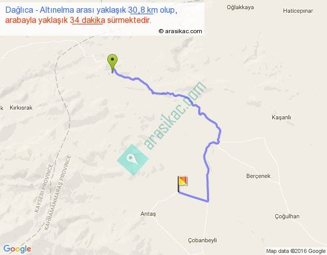 Dağlıca - Altınelma arası yaklaşık olarak 90 km/h ile yukarıda belirtilen sürede olup, iki yerin kuş uçuşu uzaklığı (mesafesi) 16'dir. Yolculuk otobüsle 44 dakika sürmektedir.