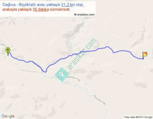 Dağlıca - Büyüktatlı arası yaklaşık olarak 90 km/h ile yukarıda belirtilen sürede olup, iki yerin kuş uçuşu uzaklığı (mesafesi) 17'dir. Yolculuk otobüsle 45 dakika sürmektedir.