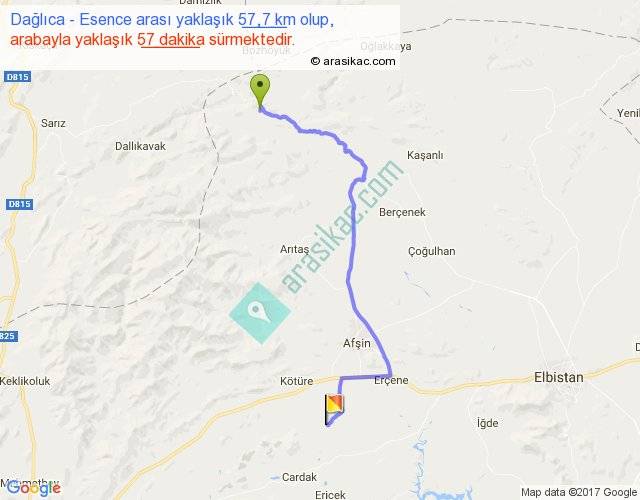 Dağlıca - Esence arası yaklaşık olarak 90 km/h ile yukarıda belirtilen sürede olup, iki yerin kuş uçuşu uzaklığı (mesafesi) 38'dir. Yolculuk otobüsle 1 saat 14 dakika sürmektedir.