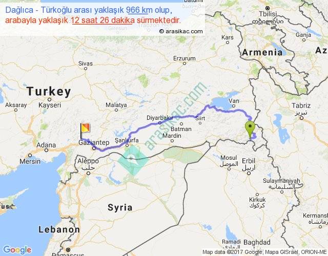 Dağlıca - Türkoğlu arası yaklaşık olarak 90 km/h ile yukarıda belirtilen sürede olup, iki yerin kuş uçuşu uzaklığı (mesafesi) 636'dir. Eğer belirtilen yerler arasında uçak seferi var ise bu süre uçakla 58 dakika'ya kadar düşebilir. Yolculuk otobüsle 16 saat 9 dakika sürmektedir.
