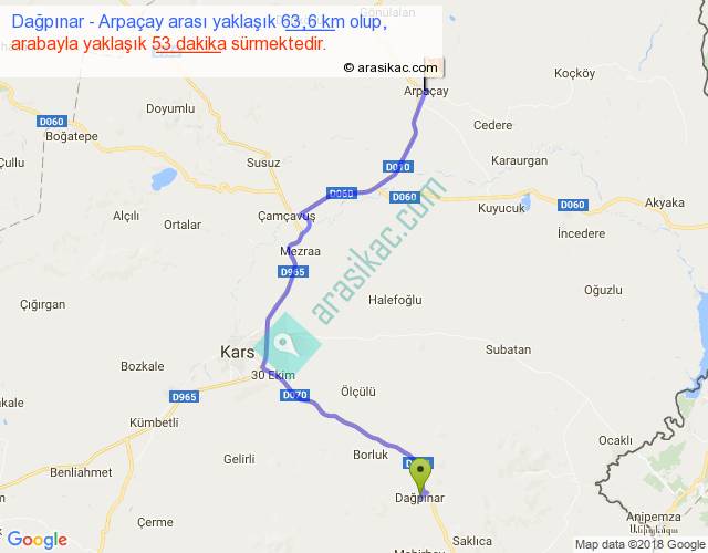 Dağpınar - Arpaçay arası yaklaşık olarak 90 km/h ile yukarıda belirtilen sürede olup, iki yerin kuş uçuşu uzaklığı (mesafesi) 42'dir. Yolculuk otobüsle 1 saat 8 dakika sürmektedir.