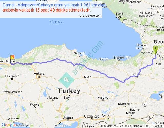 Damal - Adapazarı Sakarya arası yaklaşık olarak 90 km/h ile yukarıda belirtilen sürede olup, iki yerin kuş uçuşu uzaklığı (mesafesi) 1036'dir. Eğer belirtilen yerler arasında uçak seferi var ise bu süre uçakla 1 saat 35 dakika'ya kadar düşebilir. Yolculuk otobüsle 20 saat 33 dakika sürmektedir.