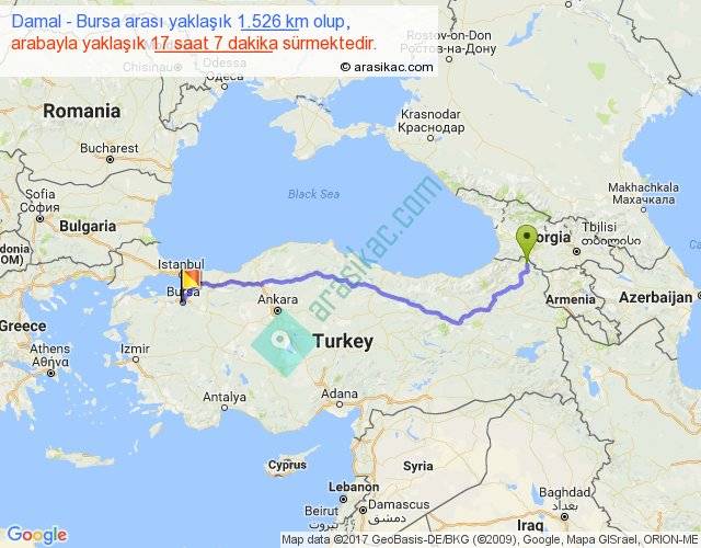 Damal - Bursa arası yaklaşık olarak 90 km/h ile yukarıda belirtilen sürede olup, iki yerin kuş uçuşu uzaklığı (mesafesi) 1159'dir. Eğer belirtilen yerler arasında uçak seferi var ise bu süre uçakla 1 saat 46 dakika'ya kadar düşebilir. Yolculuk otobüsle 22 saat 15 dakika sürmektedir.