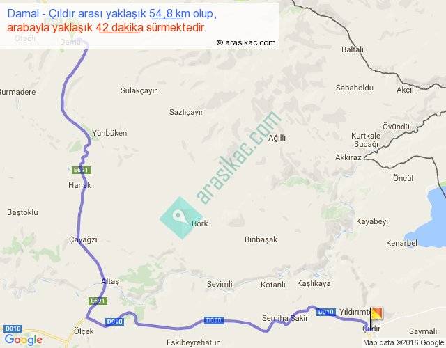 Damal - Çıldır arası yaklaşık olarak 90 km/h ile yukarıda belirtilen sürede olup, iki yerin kuş uçuşu uzaklığı (mesafesi) 34'dir. Yolculuk otobüsle 54 dakika sürmektedir.