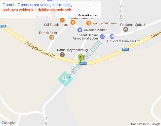 Damal - Damal arası yaklaşık olarak 90 km/h ile yukarıda belirtilen sürede olup, iki yerin kuş uçuşu uzaklığı (mesafesi) 0'dir. Yolculuk otobüsle 1 dakika sürmektedir.