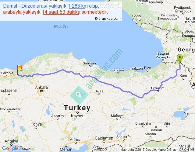 Damal - Düzce arası yaklaşık olarak 90 km/h ile yukarıda belirtilen sürede olup, iki yerin kuş uçuşu uzaklığı (mesafesi) 974'dir. Eğer belirtilen yerler arasında uçak seferi var ise bu süre uçakla 1 saat 29 dakika'ya kadar düşebilir. Yolculuk otobüsle 19 saat 28 dakika sürmektedir.