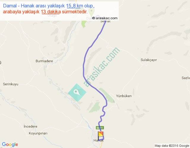 Damal - Hanak arası yaklaşık olarak 90 km/h ile yukarıda belirtilen sürede olup, iki yerin kuş uçuşu uzaklığı (mesafesi) 12'dir. Yolculuk otobüsle 16 dakika sürmektedir.