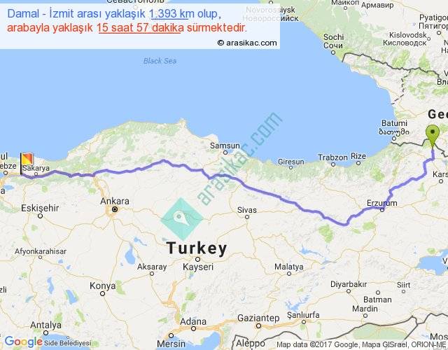 Damal - İzmit arası yaklaşık olarak 90 km/h ile yukarıda belirtilen sürede olup, iki yerin kuş uçuşu uzaklığı (mesafesi) 1076'dir. Eğer belirtilen yerler arasında uçak seferi var ise bu süre uçakla 1 saat 39 dakika'ya kadar düşebilir. Yolculuk otobüsle 20 saat 44 dakika sürmektedir.
