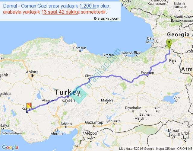 Damal - Osman Gazi arası yaklaşık olarak 90 km/h ile yukarıda belirtilen sürede olup, iki yerin kuş uçuşu uzaklığı (mesafesi) 964'dir. Eğer belirtilen yerler arasında uçak seferi var ise bu süre uçakla 1 saat 28 dakika'ya kadar düşebilir. Yolculuk otobüsle 17 saat 48 dakika sürmektedir.