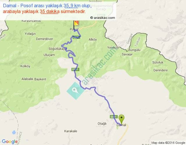 Damal - Posof arası yaklaşık olarak 90 km/h ile yukarıda belirtilen sürede olup, iki yerin kuş uçuşu uzaklığı (mesafesi) 21'dir. Yolculuk otobüsle 45 dakika sürmektedir.