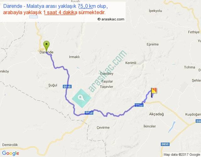 Darende - Malatya arası yaklaşık olarak 90 km/h ile yukarıda belirtilen sürede olup, iki yerin kuş uçuşu uzaklığı (mesafesi) 43'dir. Yolculuk otobüsle 1 saat 23 dakika sürmektedir.