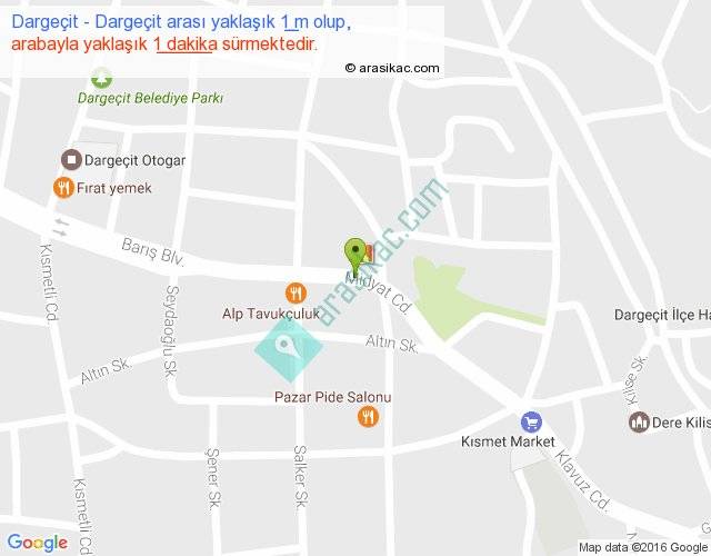 Dargeçit - Dargeçit arası yaklaşık olarak 90 km/h ile yukarıda belirtilen sürede olup, iki yerin kuş uçuşu uzaklığı (mesafesi) 0'dir. Yolculuk otobüsle 1 dakika sürmektedir.