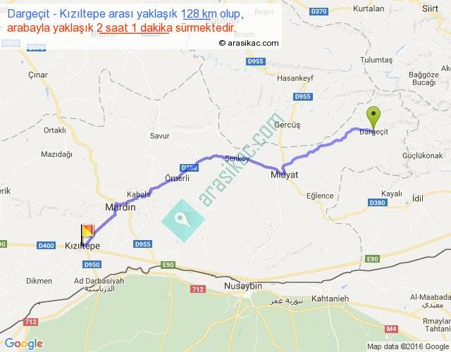 Dargeçit - Kızıltepe arası yaklaşık olarak 90 km/h ile yukarıda belirtilen sürede olup, iki yerin kuş uçuşu uzaklığı (mesafesi) 107'dir. Yolculuk otobüsle 2 saat 37 dakika sürmektedir.