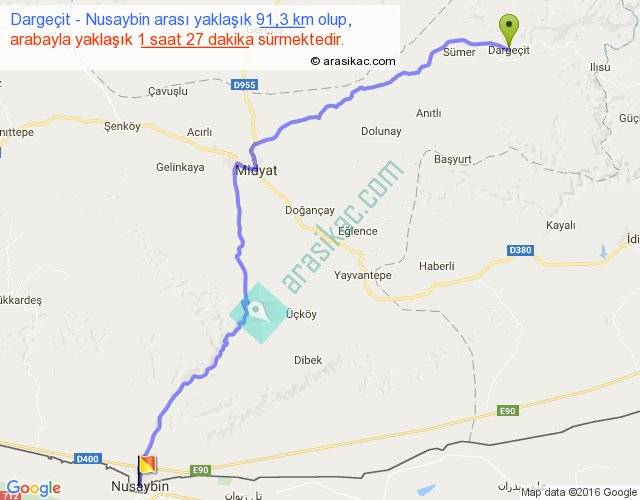 Dargeçit - Nusaybin arası yaklaşık olarak 90 km/h ile yukarıda belirtilen sürede olup, iki yerin kuş uçuşu uzaklığı (mesafesi) 69'dir. Yolculuk otobüsle 1 saat 53 dakika sürmektedir.