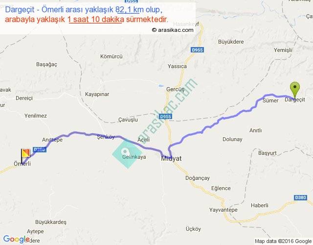 Dargeçit - Ömerli arası yaklaşık olarak 90 km/h ile yukarıda belirtilen sürede olup, iki yerin kuş uçuşu uzaklığı (mesafesi) 69'dir. Yolculuk otobüsle 1 saat 31 dakika sürmektedir.