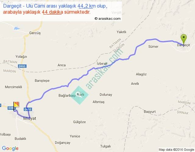 Dargeçit - Ulu Cami arası yaklaşık olarak 90 km/h ile yukarıda belirtilen sürede olup, iki yerin kuş uçuşu uzaklığı (mesafesi) 36'dir. Yolculuk otobüsle 57 dakika sürmektedir.