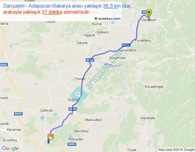 Darıçayırı - Adapazarı Sakarya arası yaklaşık olarak 90 km/h ile yukarıda belirtilen sürede olup, iki yerin kuş uçuşu uzaklığı (mesafesi) 30'dir. Yolculuk otobüsle 48 dakika sürmektedir.